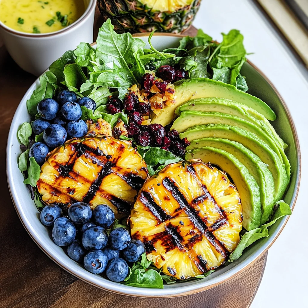4. Assemble the salad by placing mixed greens in bowls, adding grilled pineapple slices, corn kernels (removed from cob), avocado slices, blueberries, and topping with the creamy dressing.