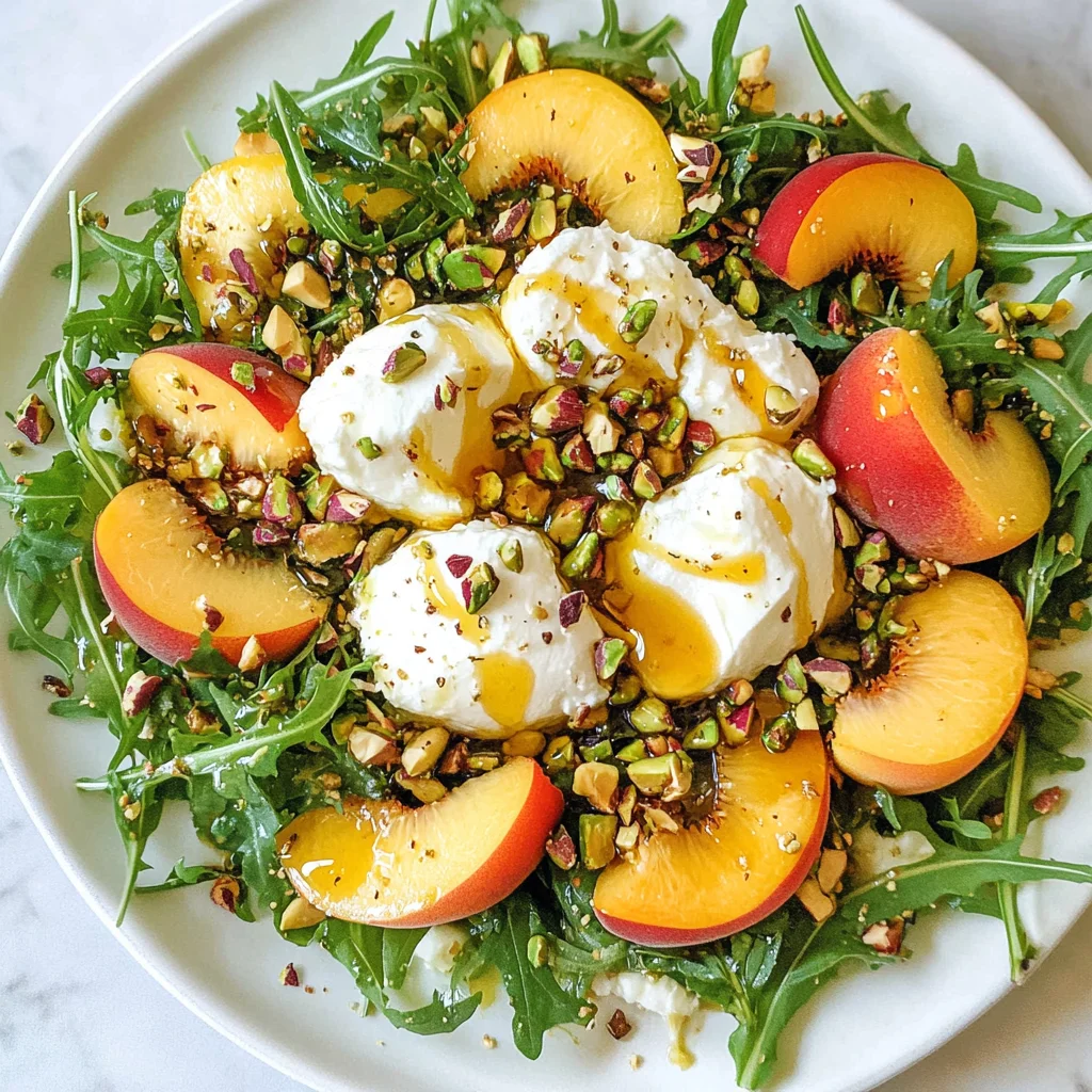 Discover the vibrant flavors of our Peach Burrata Arugula Salad, a delightful dish perfect for summer gatherings or a quick lunch. This refreshing salad features ripe, juicy peaches that pair beautifully with creamy burrata cheese and peppery arugula. Crunchy roasted pistachios add texture, while a simple honey vinaigrette ties all the flavors together.